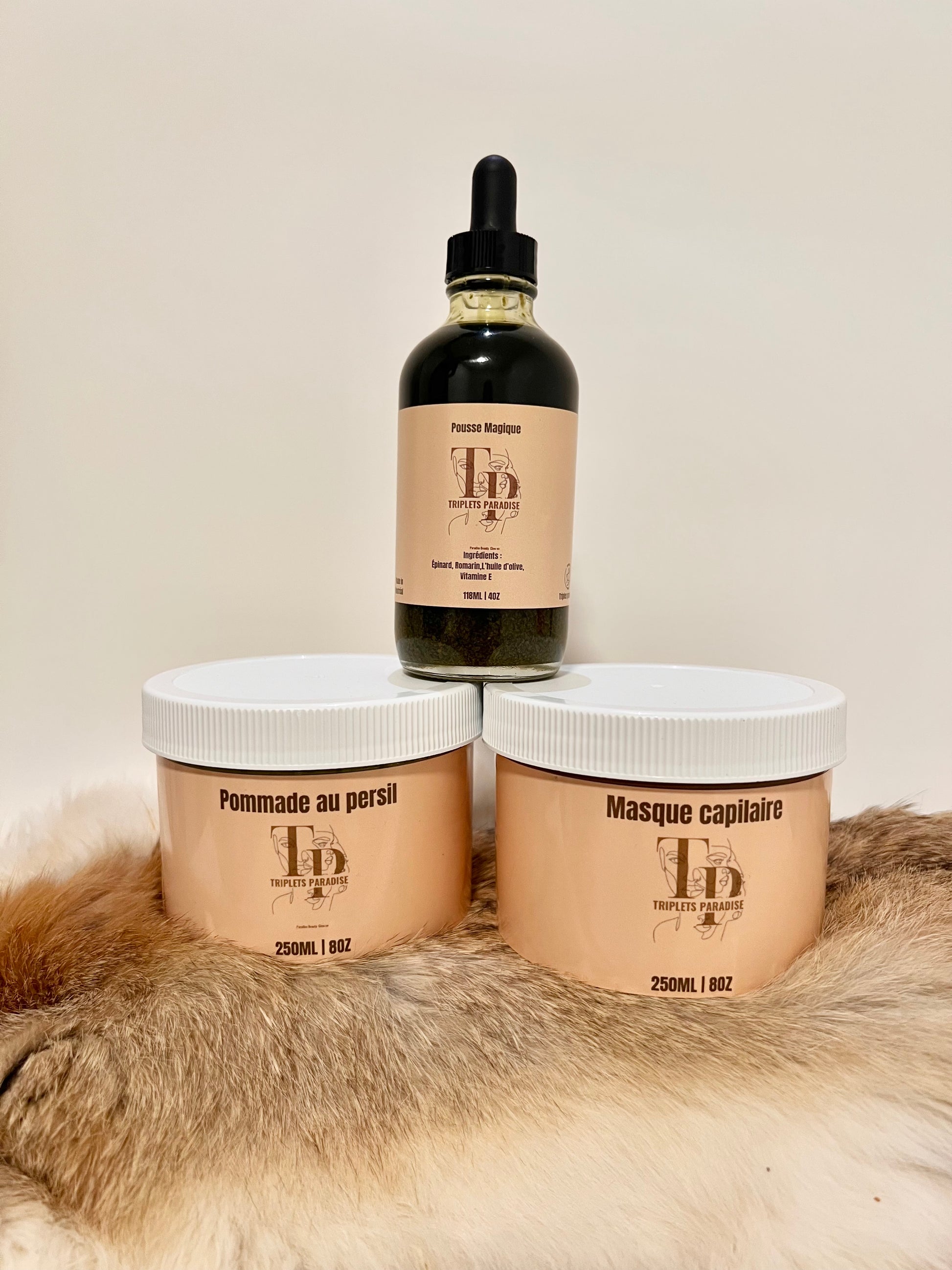 Le masque revitalise, l’huile renforce et la pommade scelle l’hydratation pour une finition parfaite.